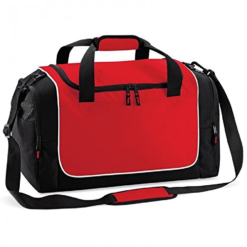 Red gym sports bag duffel holdall bags Compact size to fit most lockers, with detachable adjustable shoulder strap and pad. End pockets, one with mesh ventilation panel. Protective base feet. Internal baseboard. Padded hand grip. Dimensions 47 x 30 x 27cm Capacity 30 Litres